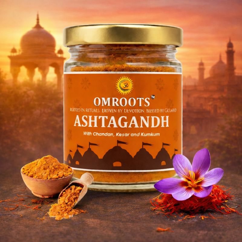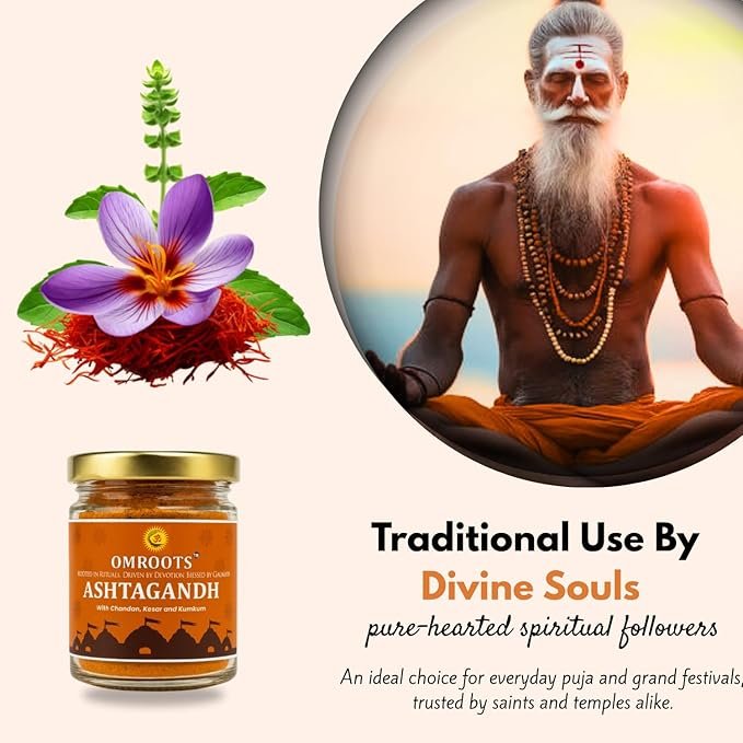 Omroots presents Herbal Ashtagandh Powder, a divine blend of Chandan (Sandalwood), Kesar (Saffron), and Kumkum, traditionally used in temples and spiritual rituals. Known for its soothing aroma and purity, this natural sacred powder enhances the spiritual ambience during pooja, tilak, meditation, homam, and religious ceremonies.
