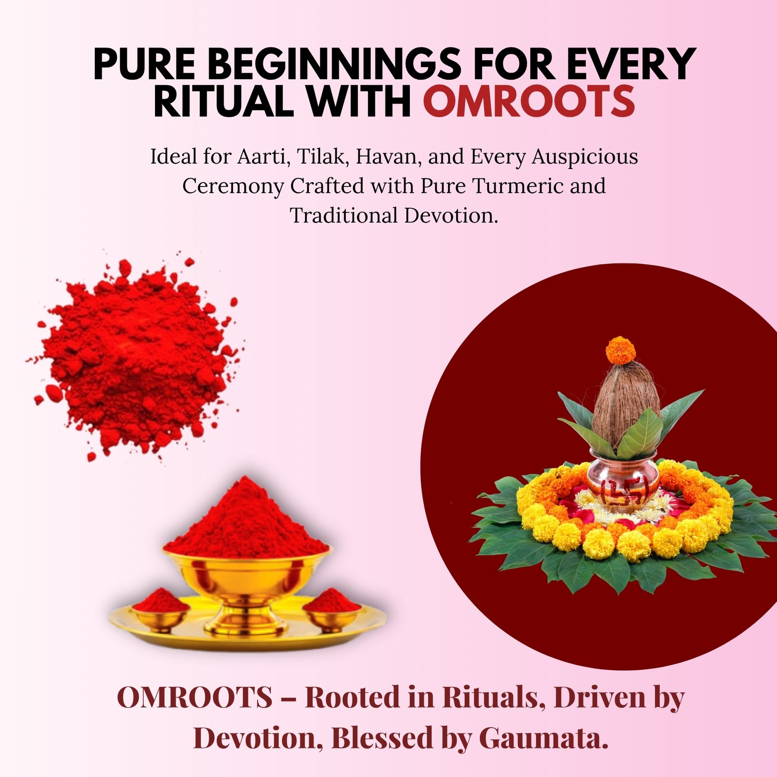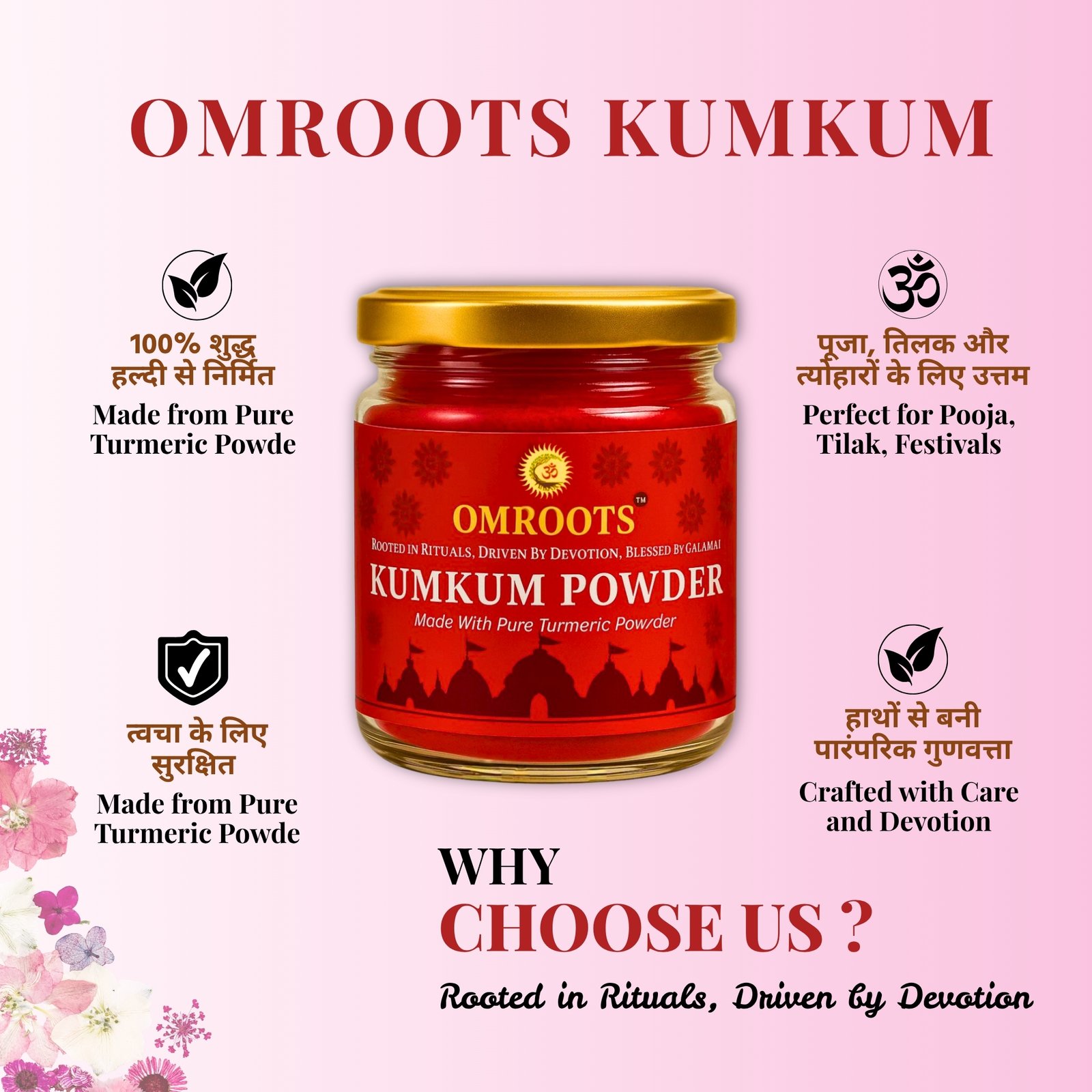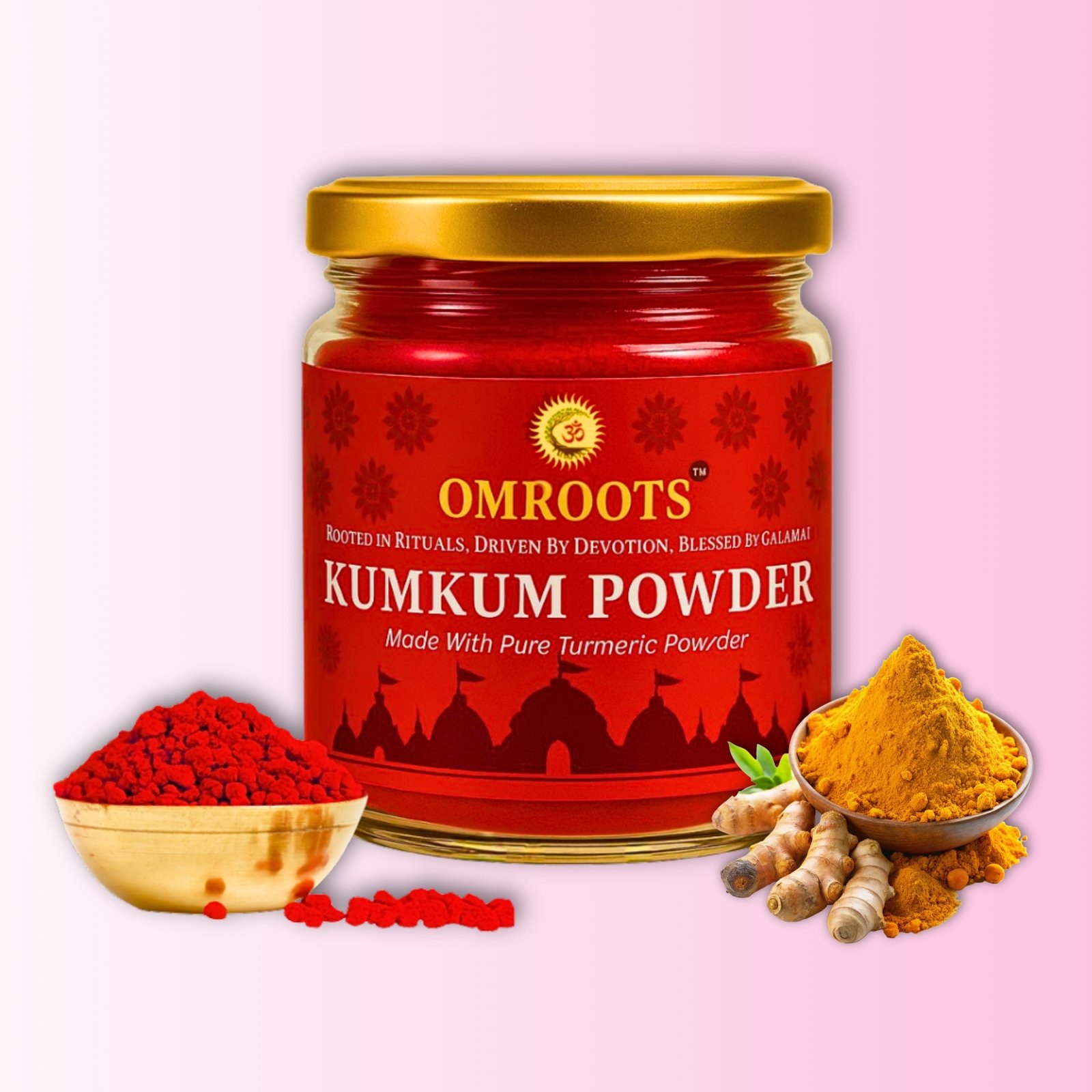 Omroots presents Pure Turmeric-Based Kumkum Powder, crafted using a traditional formula rooted in ancient Hindu rituals. This premium kumkum delivers a rich, vibrant red color ideal for tilak, daily pooja, festivals, sindoor application, and all types of religious ceremonies.