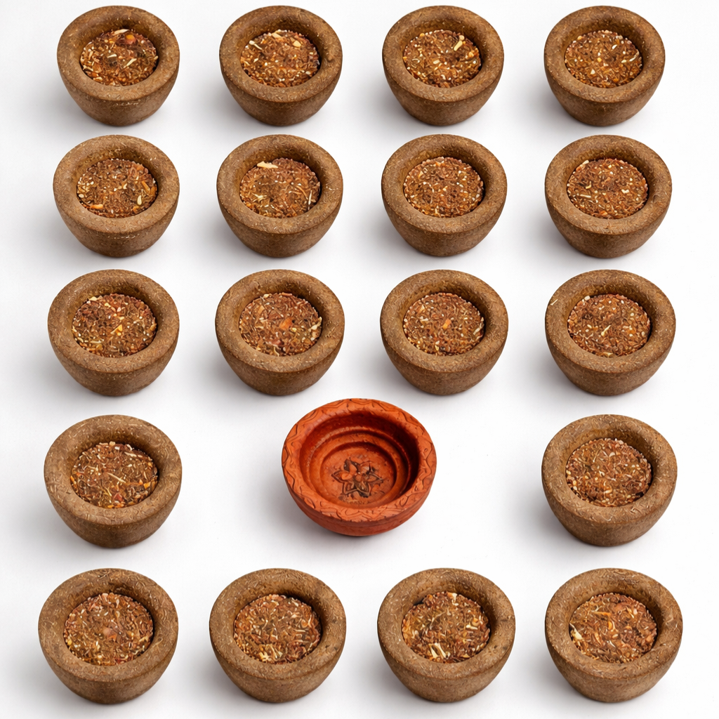 Reconnect with age-old Indian rituals using our Cow Dung Havan Cups, crafted from sun-dried cow dung and infused with natural sambrani (benzoin resin) and sandalwood fragrance. Designed for daily pooja, havan, meditation, and spiritual cleansing, these cups burn steadily, releasing a warm, grounding aroma that creates a calm and sacred atmosphere.